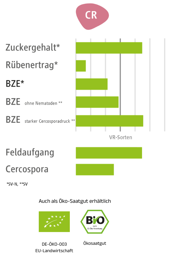 | Resistenzen / Toleranzen | Rizomania / Nematoden / Cercospora |