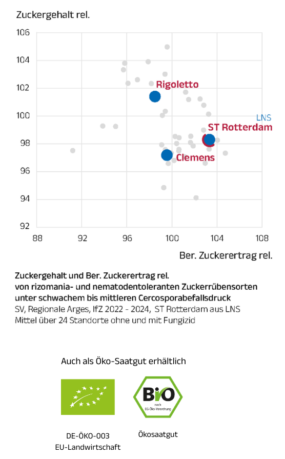 „Unsere blattgesunde Sorte Rigoletto erzeugt hohe Zuckererträge auch bei sehr hohem Cercospora- und Rostbefall. Damit weist Rigoletto eine besondere Vorzüglichkeit für alle Gebiete mit mittlerem bis hohem Befall an Blattkrankheiten auf und ist hervorragend für den